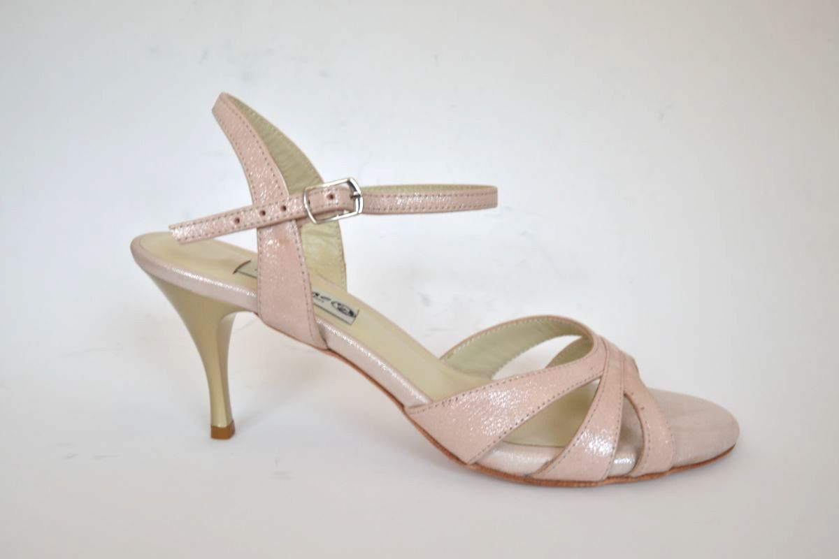 Classic open toe design with a wide ankle strap in subtle light pink pearl leather.