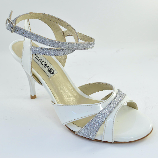 Beautiful new design in a striking combination of white patent leather and silver glitter. A statement shoe, like a jewel for your feet.