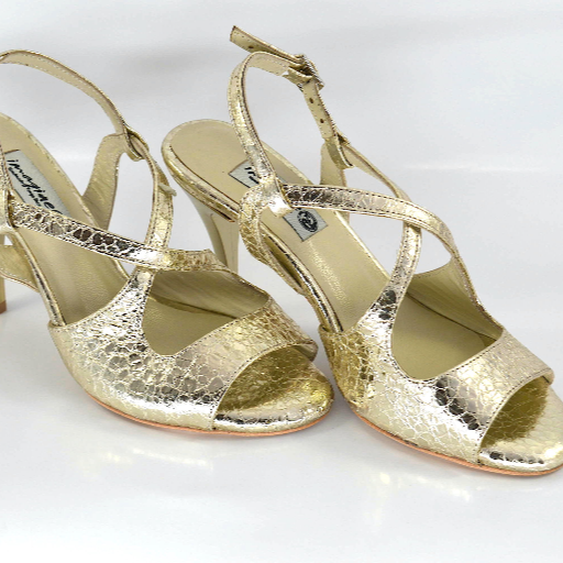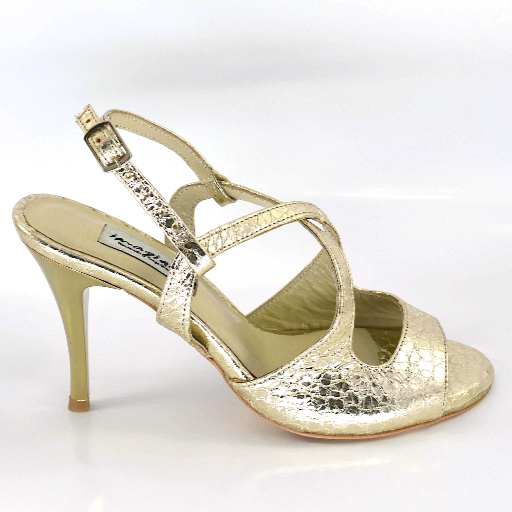 A new open-toe design with crisscross straps over the instep, made of striking gold crocodile leather