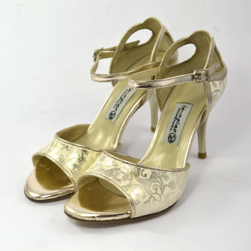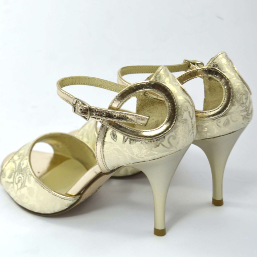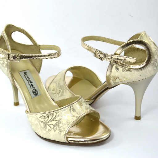 Women’s Argentine tango dance shoe, made of striking beige suede leather with gold floral patterns