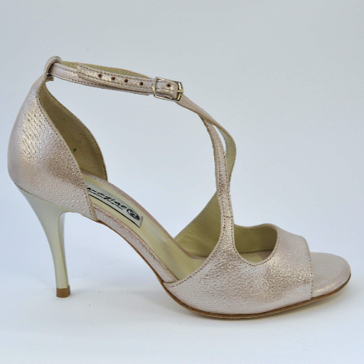Striking new design with two crisscross straps, made of soft pearl pink leather