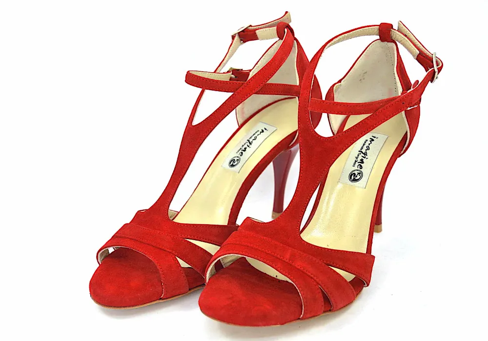New open-toe design with three straps and a distinctive double fastening over the instep, crafted from striking, vibrant red suede leather.