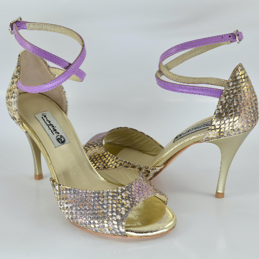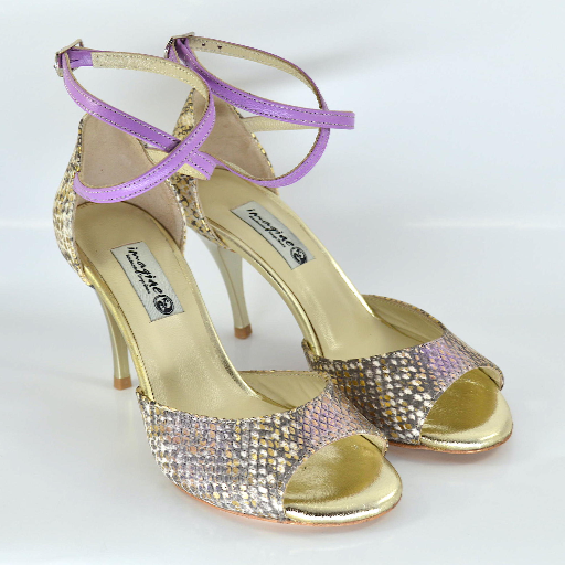 A modern and very distinctive design in purple-gold snakeskin leather with purple straps