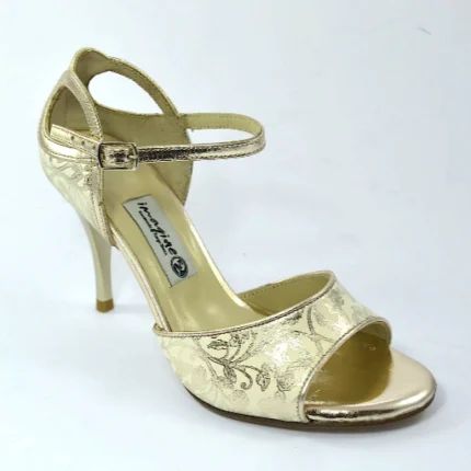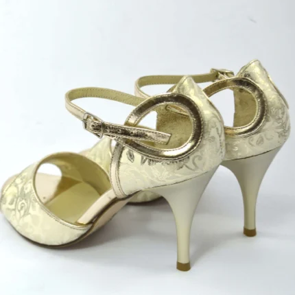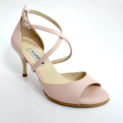 “Butterfly” design in a peep-toe style with an elegant heel, in a color combination of soft beige and pink leather.