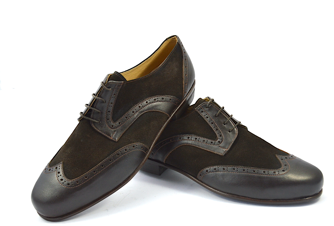 Κλασικό σχέδιο Wingtip τύπου Oxford από καφέ ματ δέρμα σε συνδυασμό από καφέ σουέτ δέρμα με διακριτικά σχέδια τύπου Brogues.