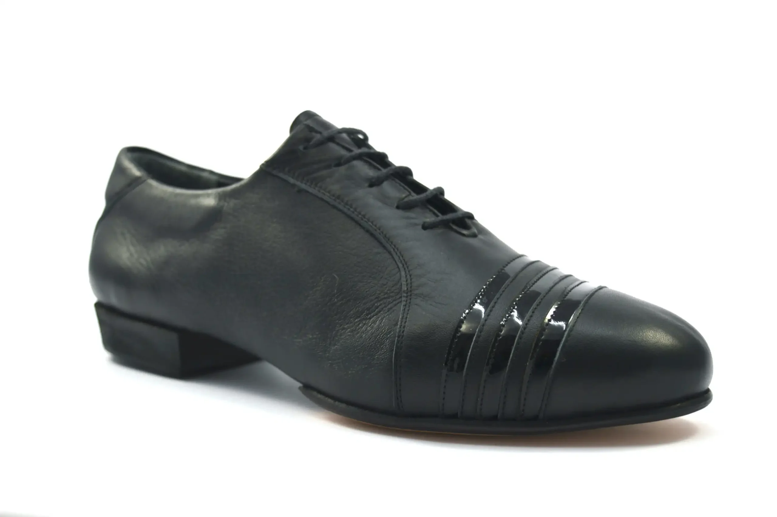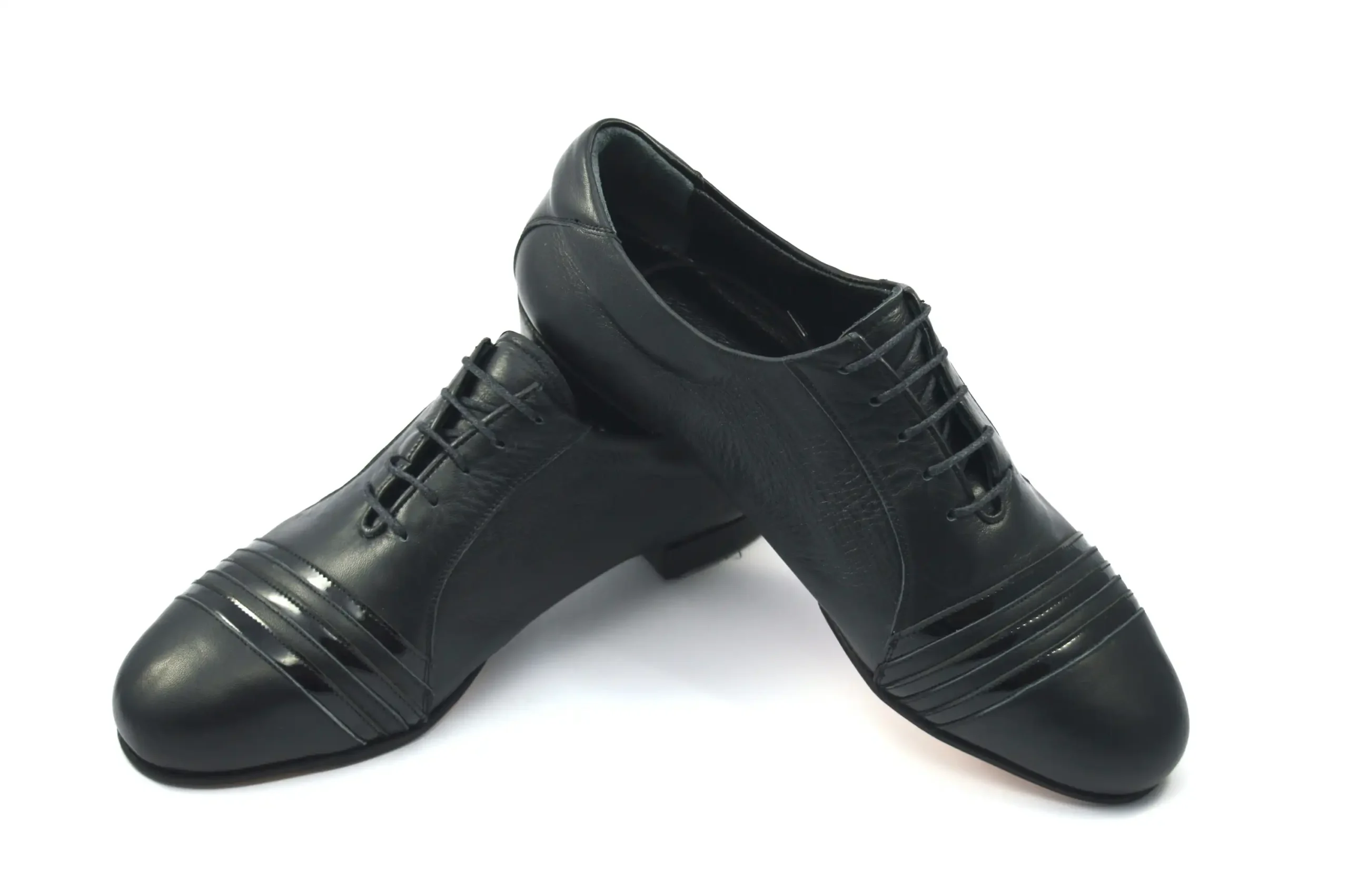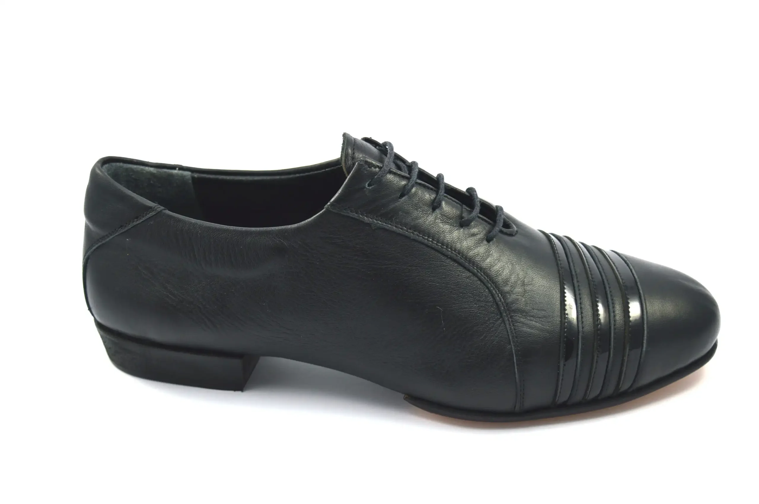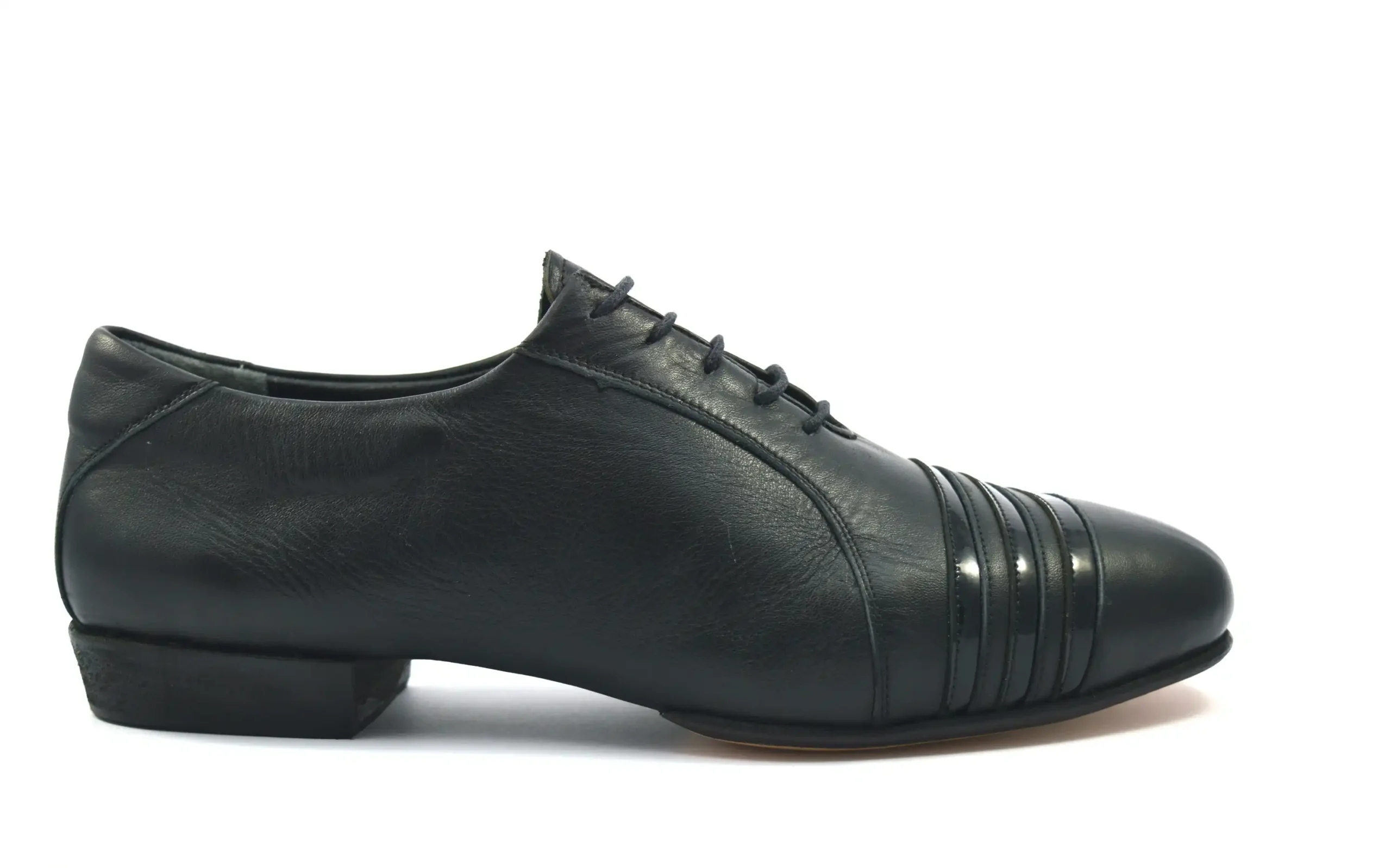 Μοντέρνο σχέδιο τύπου Sneaker από μαύρο ματ μαλακό δέρμα με σχέδιο από διακριτικές παράλληλες λωρίδες από μαύρο λουστρίνι μπροστά στα δάχτυλα.