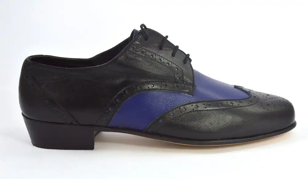 Κλασικό σχέδιο Wingtip τύπου Derby από μαύρο και μπλε ματ δέρμα με διακριτικά σχέδια τύπου Brogues.