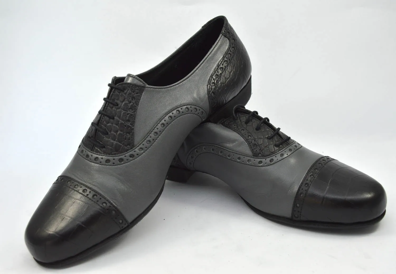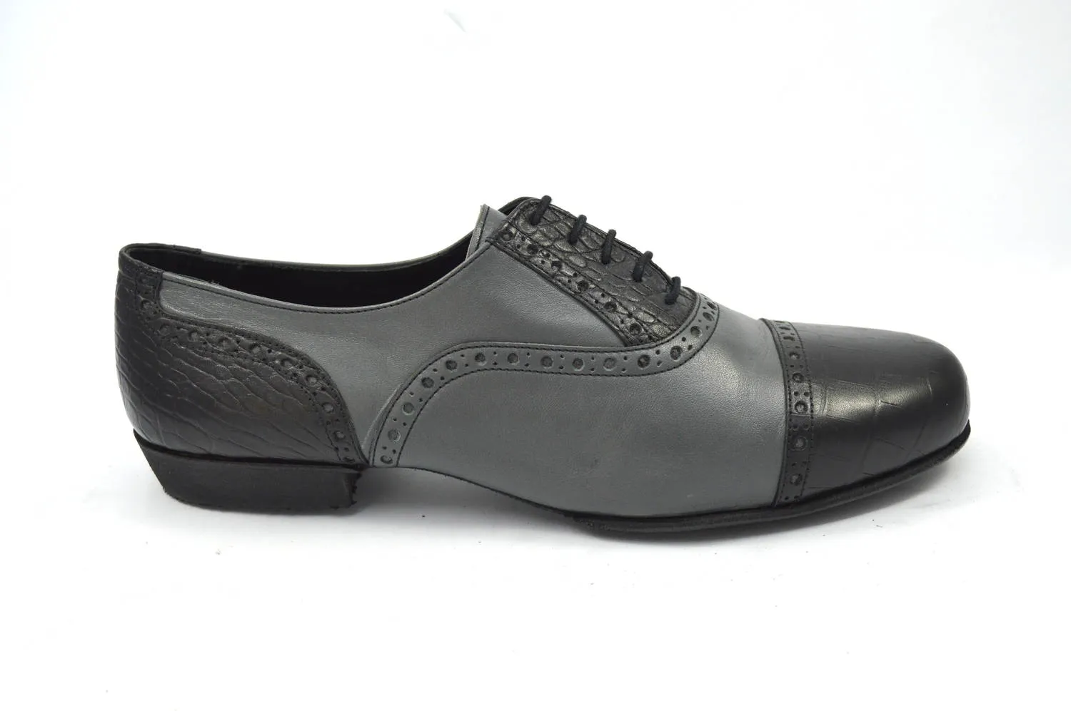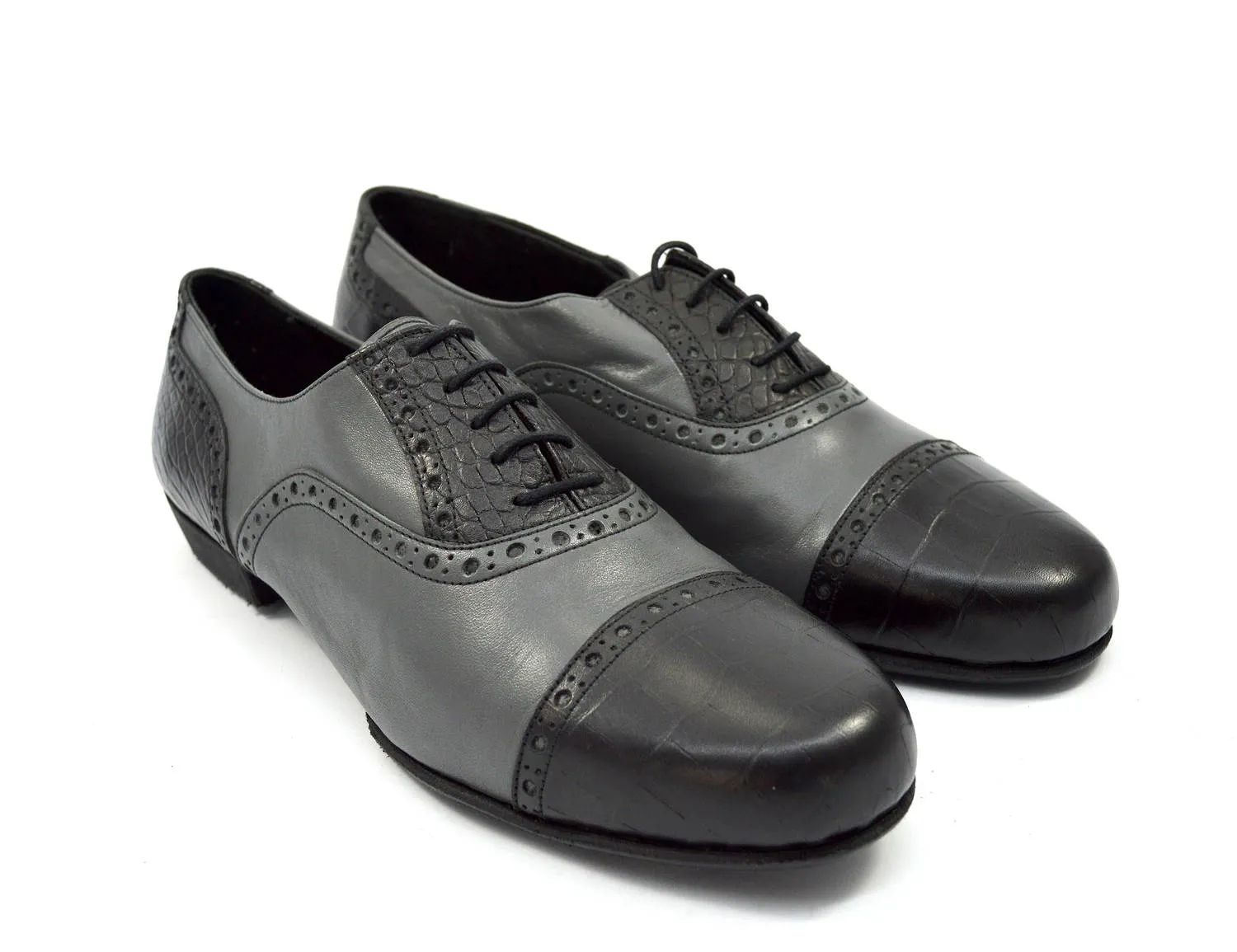 Κλασικό σχέδιο cap toe τύπου oxford σε συνδυασμό από μαύρο κροκό δέρμα και γκρι δέρμα με διακριτικά σχέδια τύπου brogues.