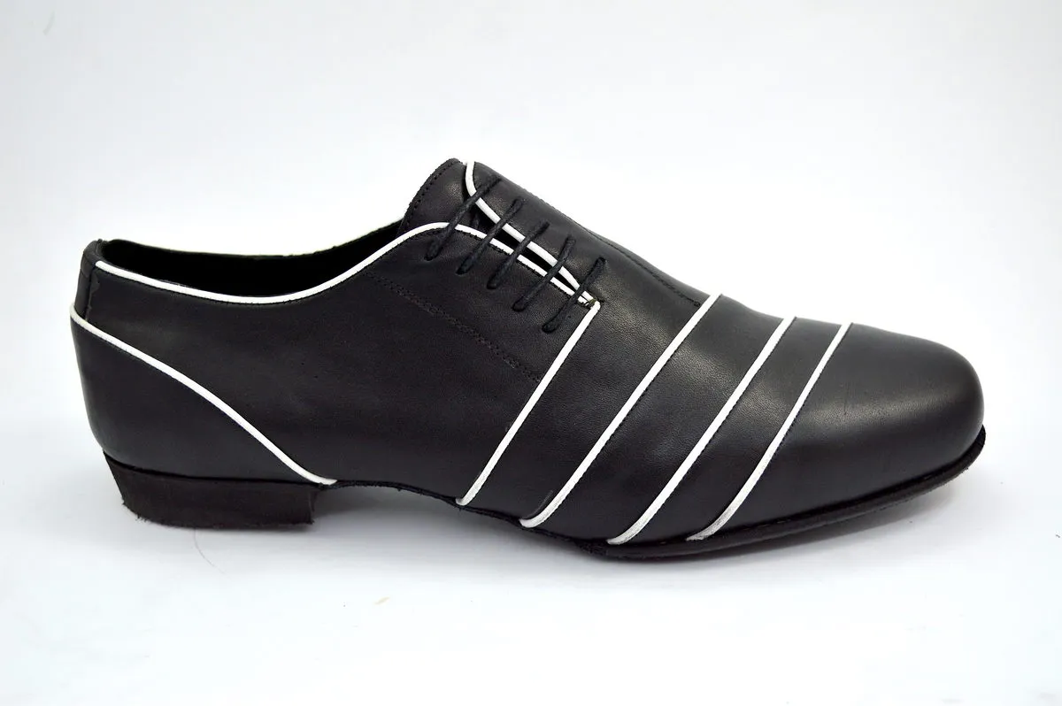 Μοντέρνο σχέδιο τύπου Sneaker από μαύρο ματ μαλακό δέρμα με σχέδιο από λευκά σιριτάκια και ιδιαίτερο δέσιμο στο πλαϊνό εξωτερικό μέρος του κουντεπιέ.