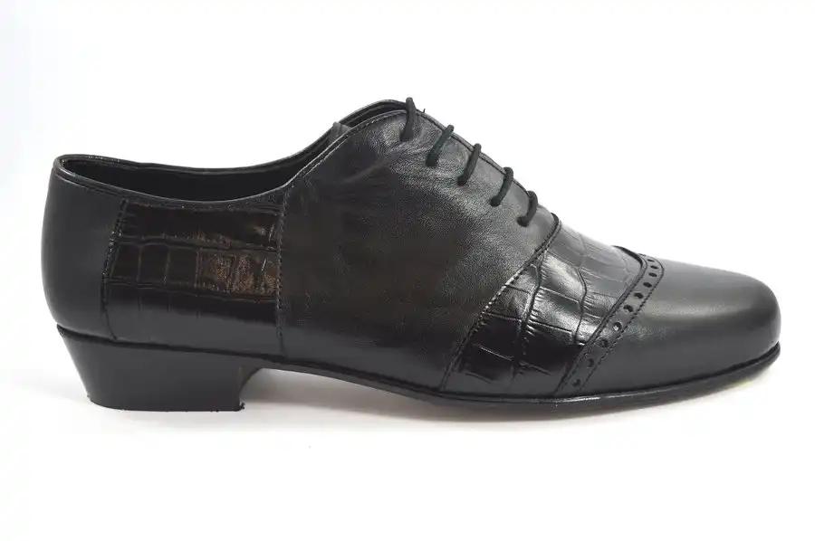 Μοντέρνο καινούριο σχέδιο τύπου Oxford σε υπέροχο συνδυασμό από μαλακό μαύρο δέρμα ματ και μαύρο κροκό δέρμα. Μπορεί να φορεθεί με επίσημη αλλά και πιο casual ένδυση.