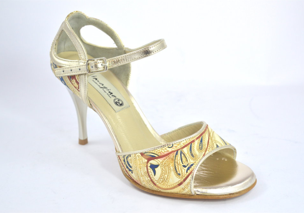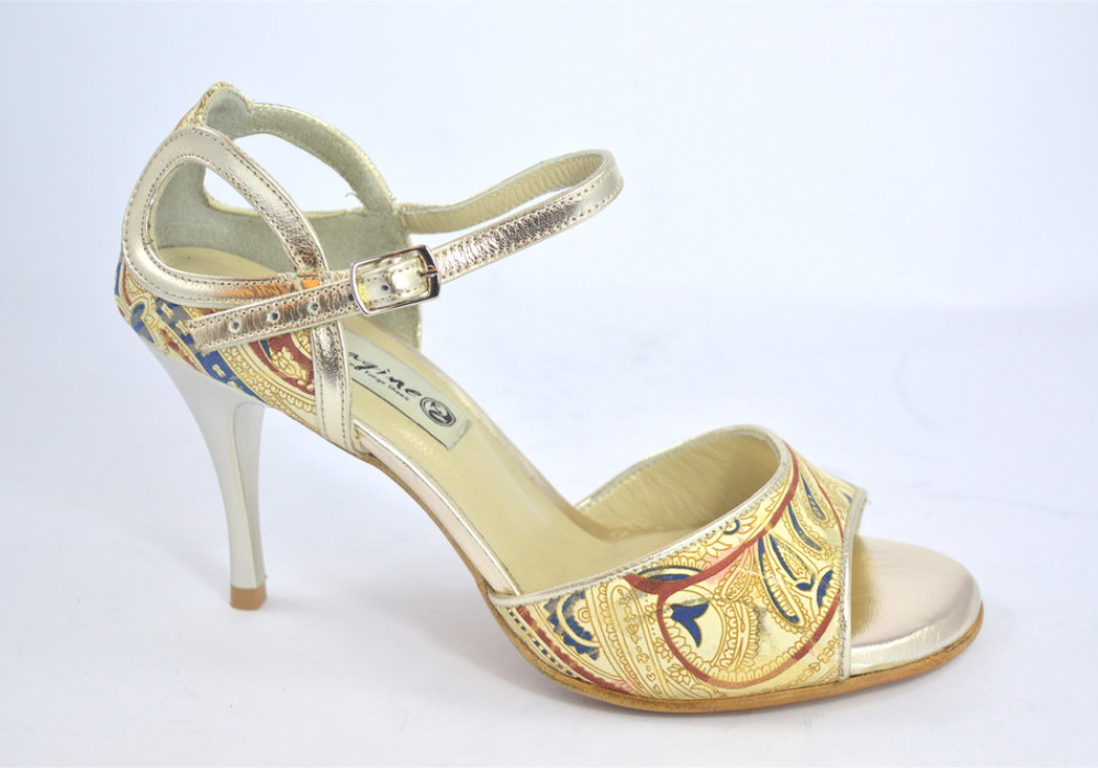 Εντυπωσιακότατο open toe παπούτσι από μαλακό μπεζ δέρμα με σχέδια από λαχούρια και ξεχωριστές μπλε-κόκκινες πινελιές.