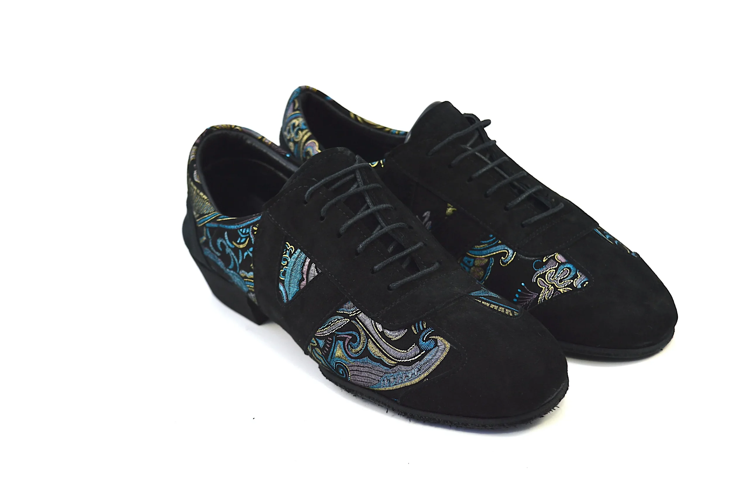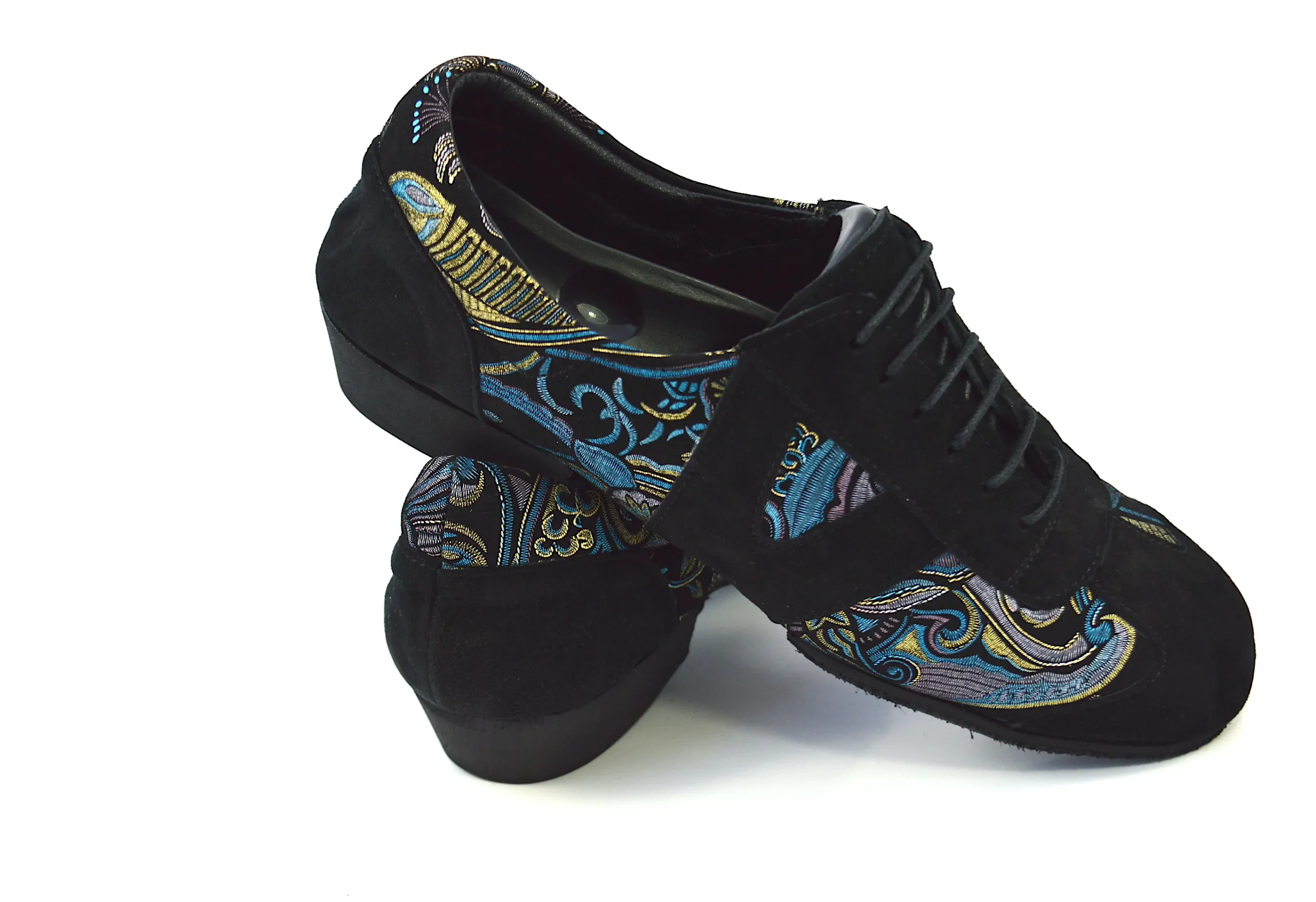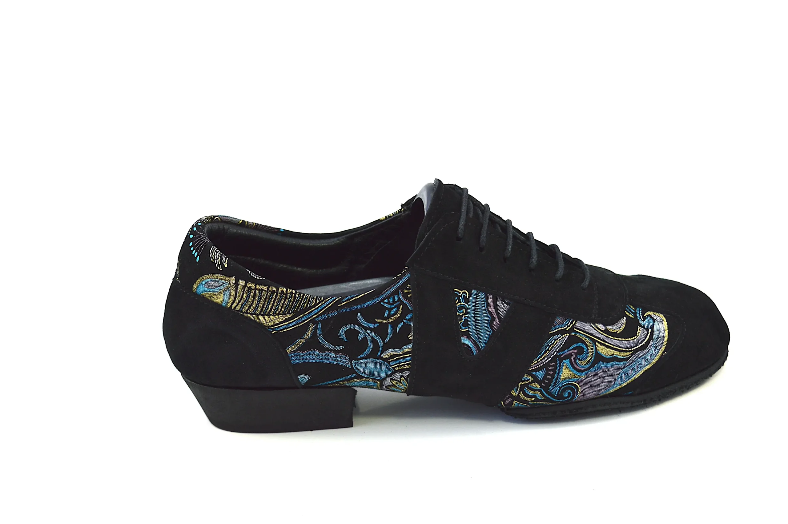 Ιδιαίτερο χορευτικό παπούτσι, για πράκτικα και για την μιλόνγκα, τύπου Oxford, από μαλακό μαύρο σουέτ δέρμα, με εντυπωσιακά χρυσο-μπλε λαχούρια.