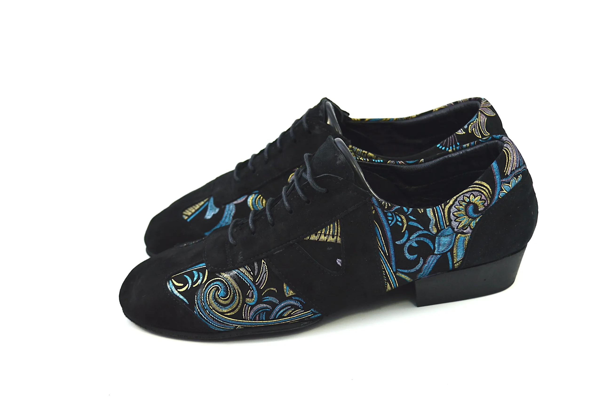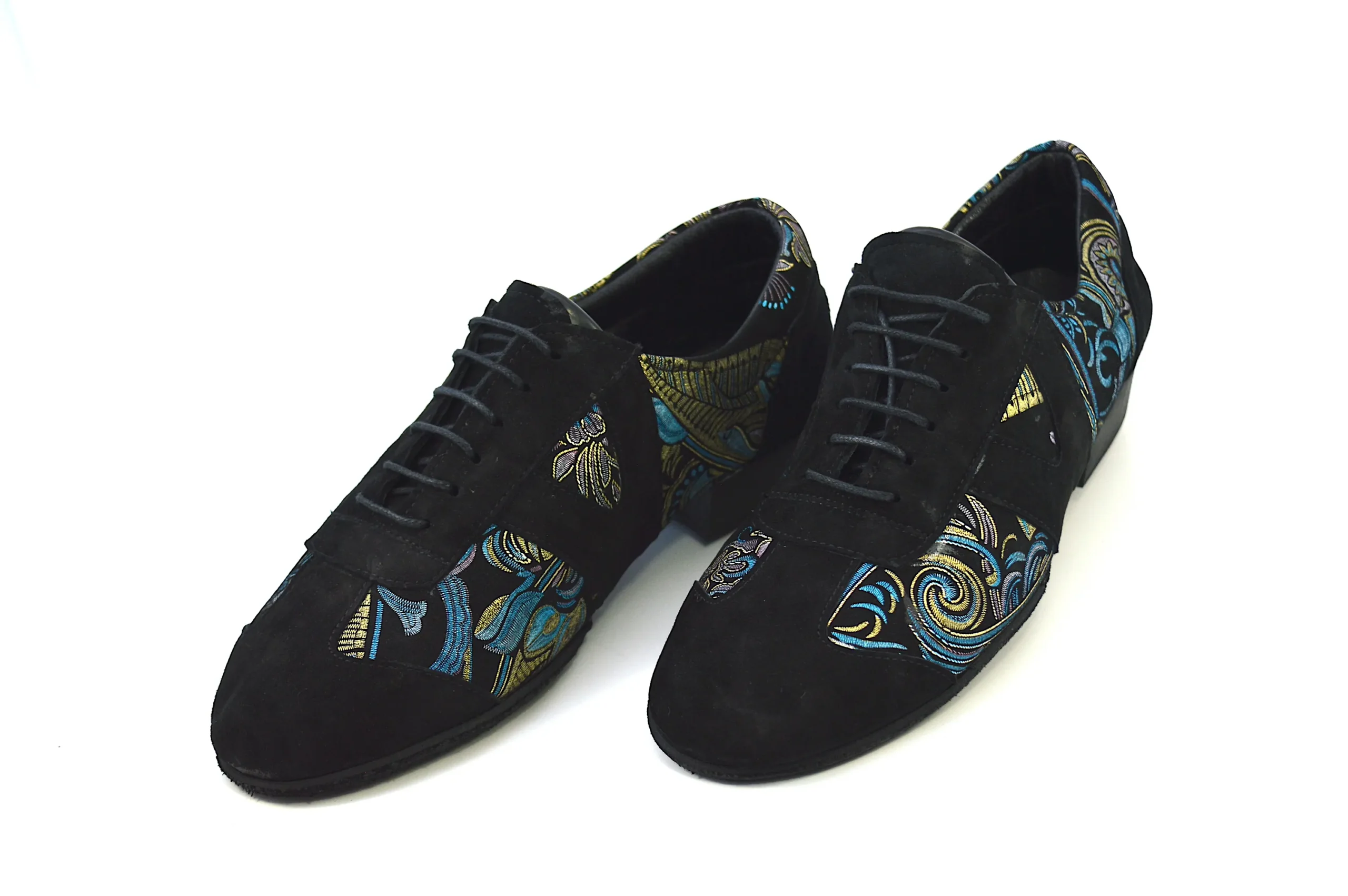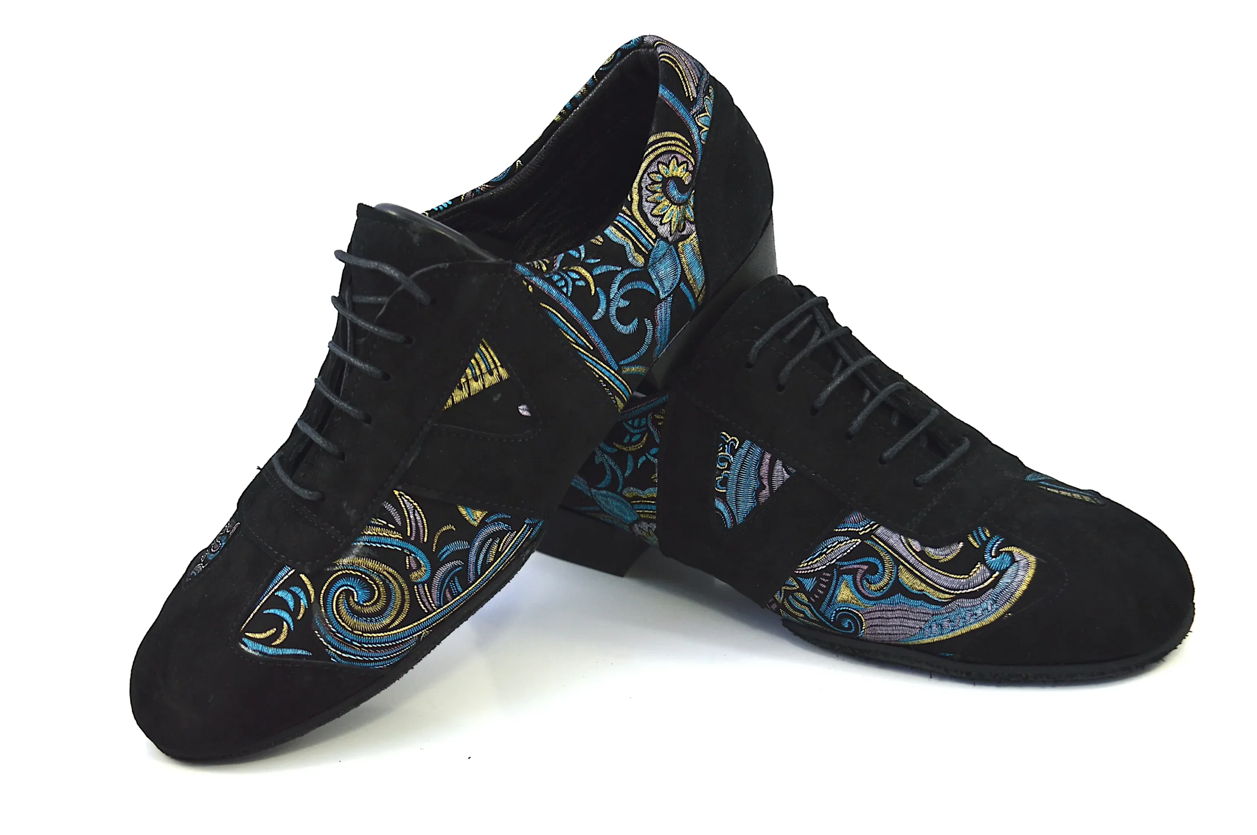 Ιδιαίτερο χορευτικό παπούτσι, για πράκτικα και για την μιλόνγκα, τύπου Oxford, από μαλακό μαύρο σουέτ δέρμα, με εντυπωσιακά χρυσο-μπλε λαχούρια.
