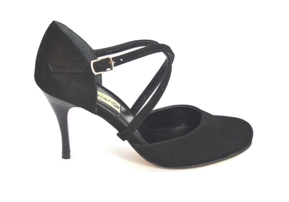 Κλασικό σχέδιο peep toe με κοφτή φτέρνα και χιαστί λουράκια στο κουντεπιέ από μαλακό μαύρο δέρμα.