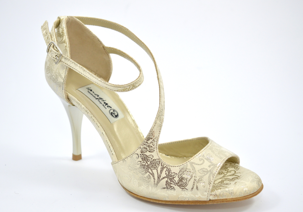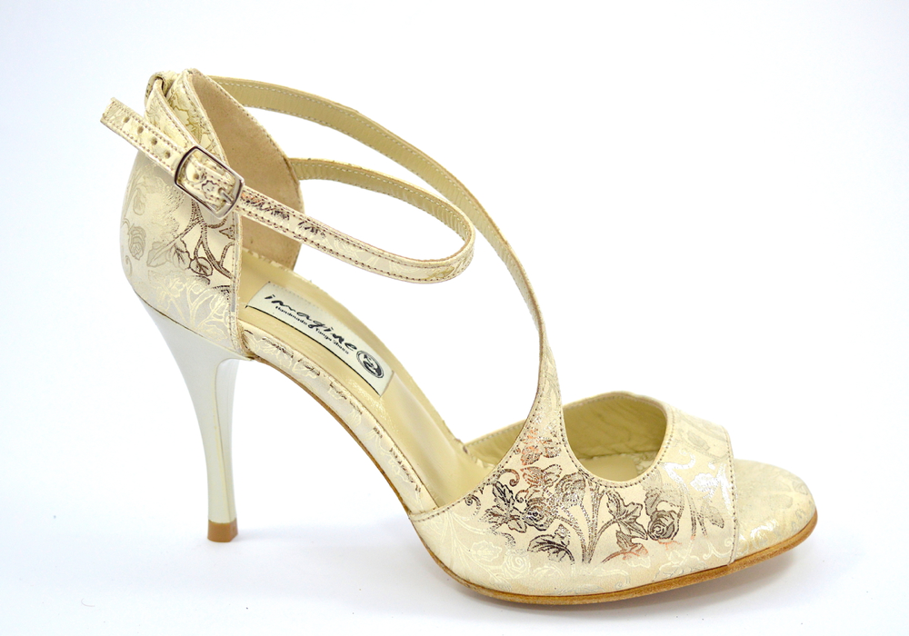 Ιδιαίτερο σχέδιο, με κλασικό δέσιμο στον αστράγαλο αλλά και λοξό στο κουντεπιέ. Από πολύ εντυπωσιακό μπεζ σουέτ δέρμα με χρυσά floral σχέδια, για επίσημες και casual εμφανίσεις.