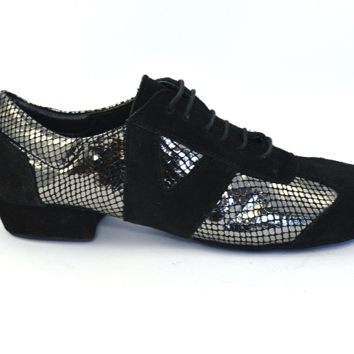 Iδιαίτερο χορευτικό παπούτσι, για πράκτικα και για την μιλόνγκα, τύπου Oxford, από μαλακό μαύρο σουέτ δέρμα, σε συνδιασμό με μαλακό ασημί δέρμα φίδι.