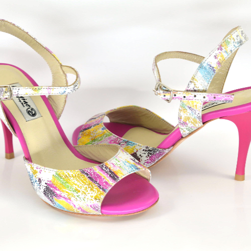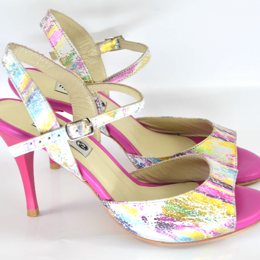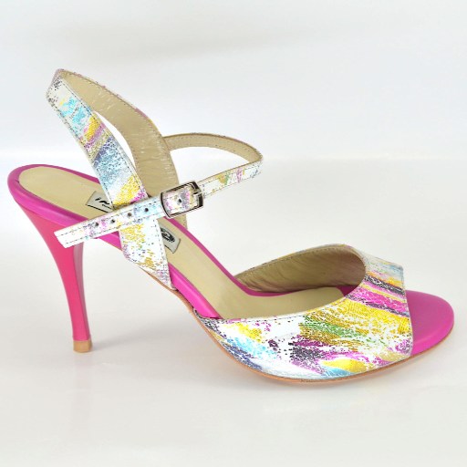 Κλασσικό σχέδιο σε open toe, με φαρδύ λουράκι στον αστράγαλο από πολύχρωμο και φούξια δέρμα.