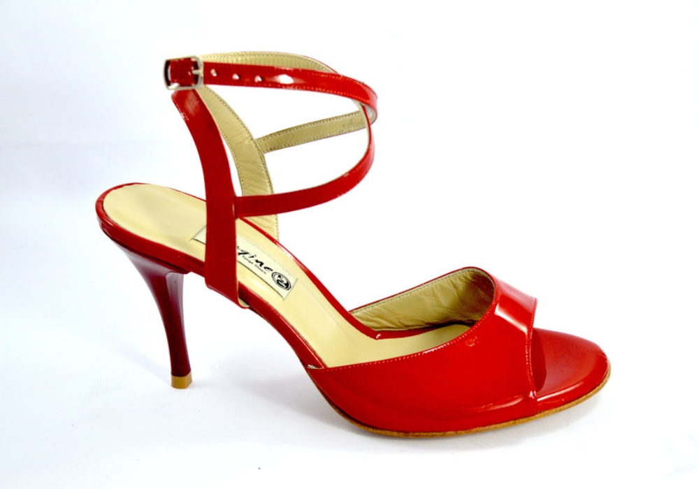 Κλασικό σχέδιο open toe, με εντυπωσιακό διπλό λουράκι στη φτέρνα από κόκκινο δέρμα λουστρίνι.