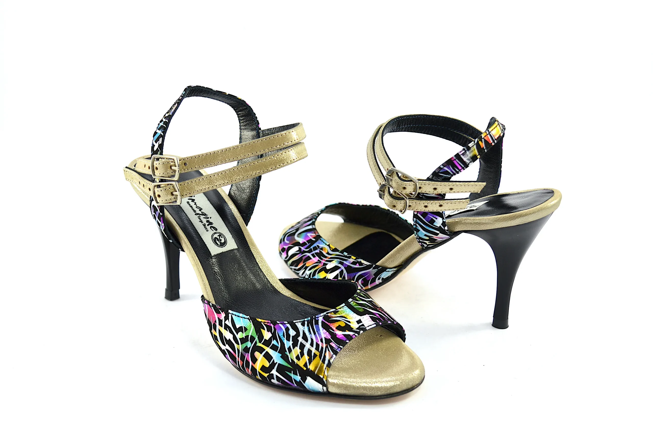 Ξώφτερνο πέδιλο σε κλασικό open toe σχέδιο από εντυπωσιακό συνδυασμό πολύχρωμου δέρματος με χρυσό δέρμα πέρλα
