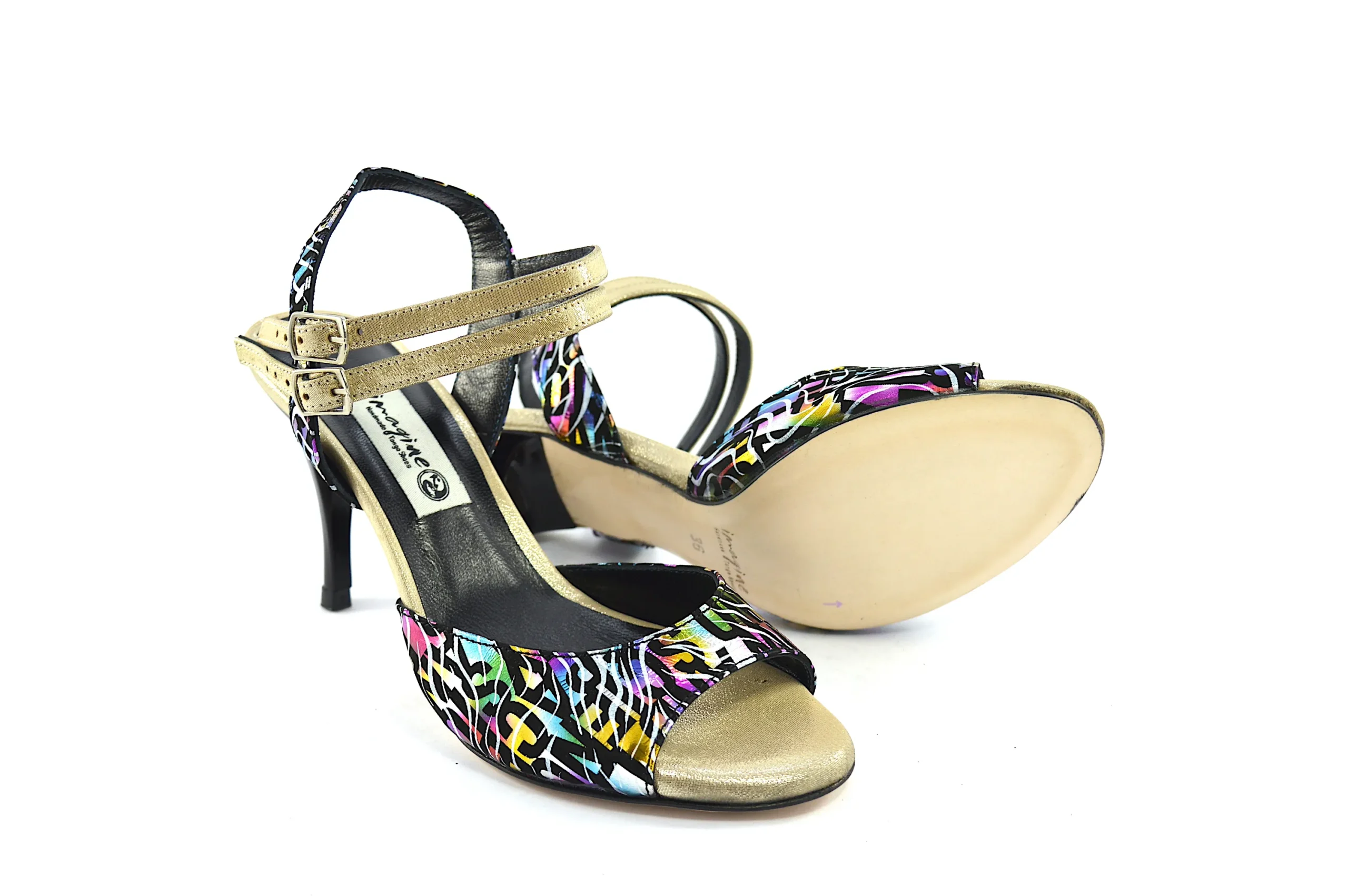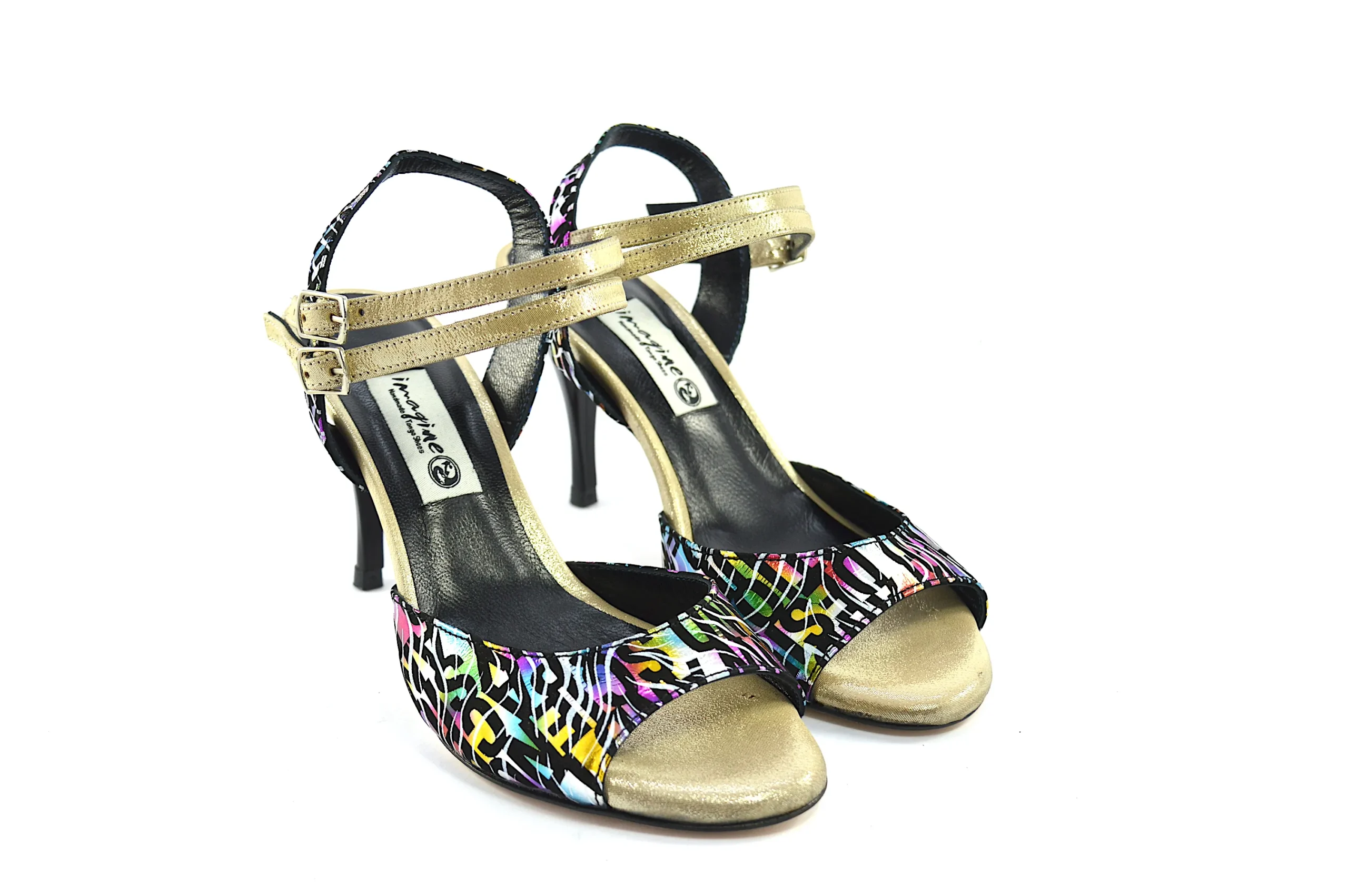 Κλασικό ξώφτερνο σχέδιο σε open toe, με διπλό λουράκι στη φτέρνα και εντυπωσιακό συνδυασμό ιδιαίτερου πολύχρωμου δέρματος με χρυσό δέρμα πέρλα.