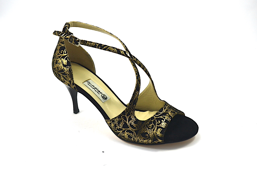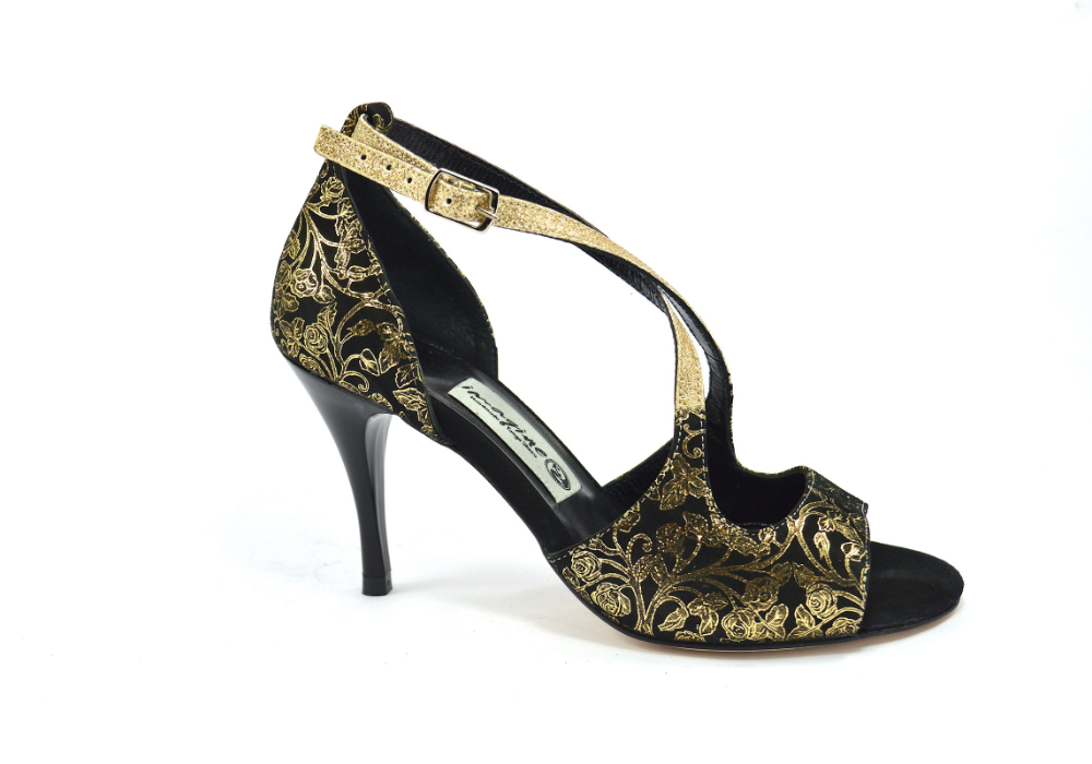 Υπέροχο σχέδιο με χιαστί λουράκια από χρυσό γκλίτερ στο κουντεπιέ, σε εξαιρετικό ιδιαίτερο συνδυασμό από χρυσό λαχούρι με μαύρο σουέτ δέρμα.