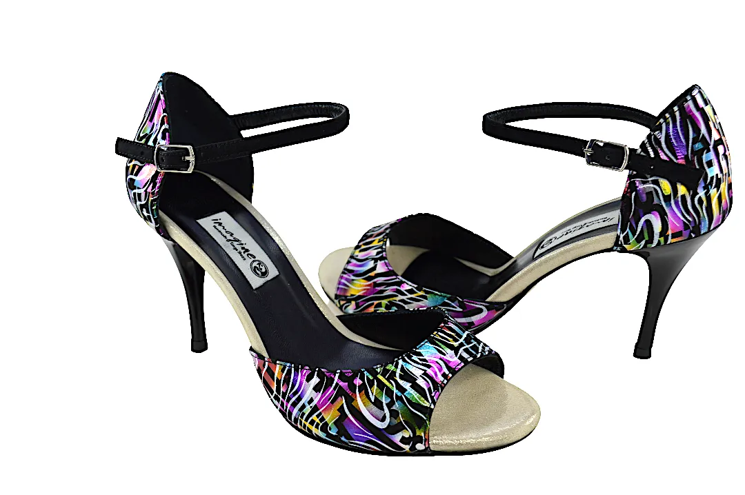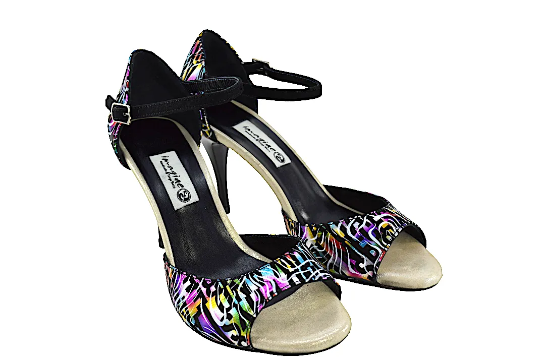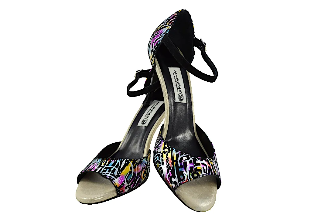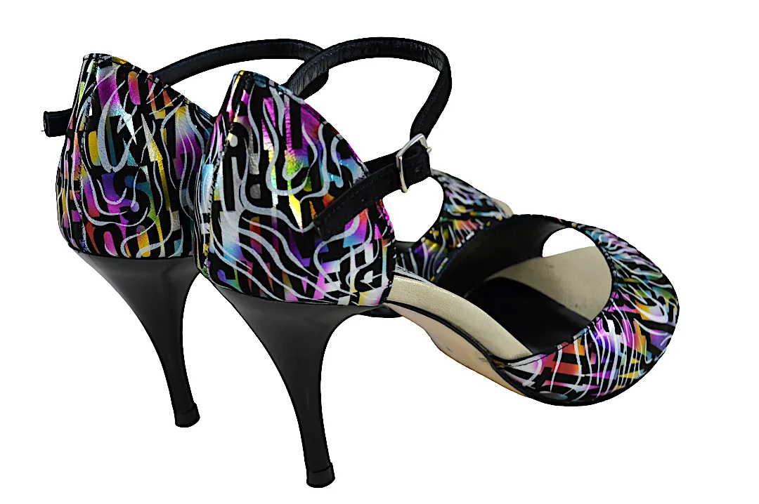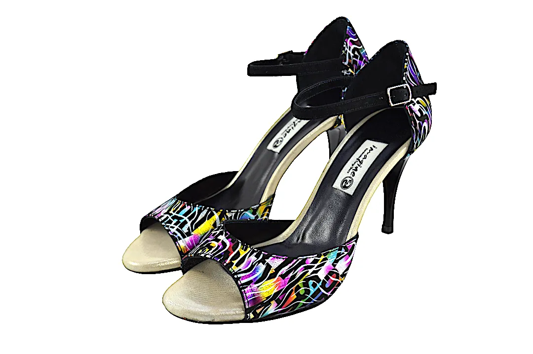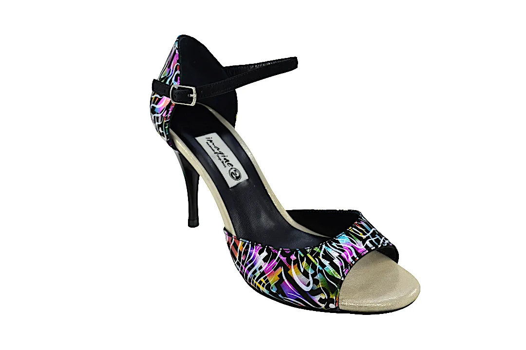 Κλασικό σχέδιο σε open toe, με λουράκι στη φτέρνα και εντυπωσιακό ιδιαίτερο πολύχρωμο δέρμα.
