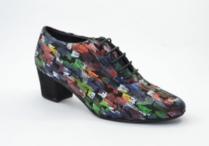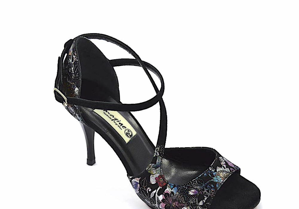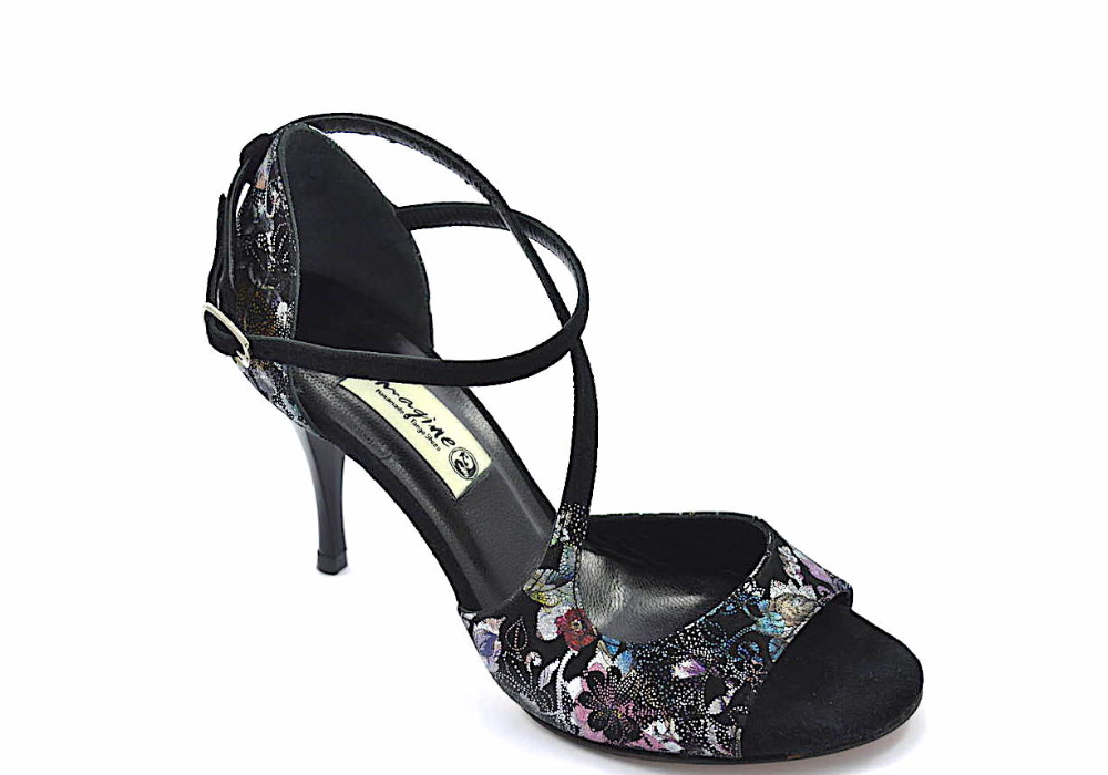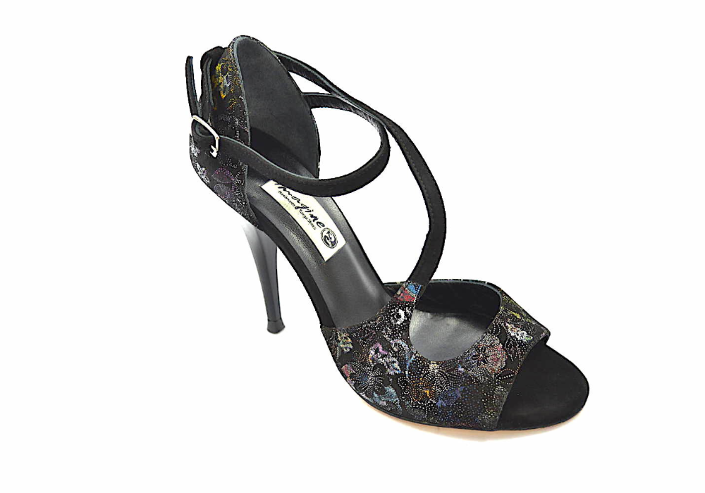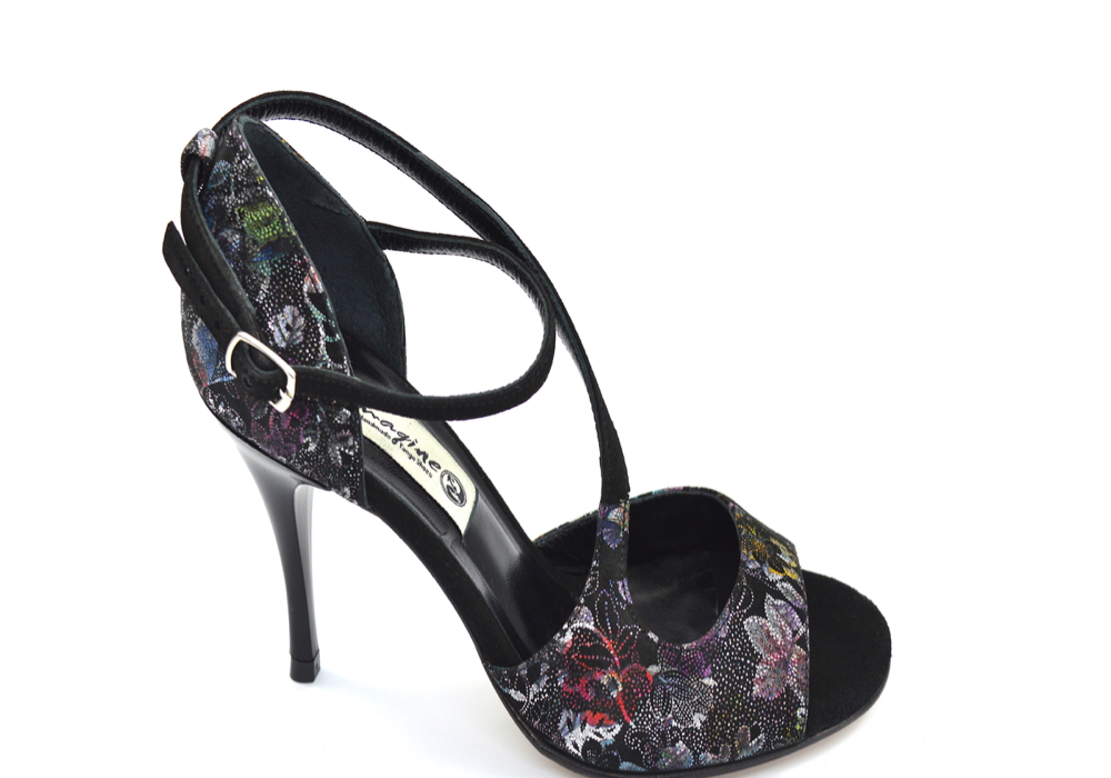Ιδιαίτερο σχέδιο σε μοντέρνα γραμμή με κυρίαρχο το μαύρο φλοράλ δέρμα με ασημί και σε άλλα χρώματα σχέδια και λοξό δέσιμο από μαύρα σουέτ λουράκια.