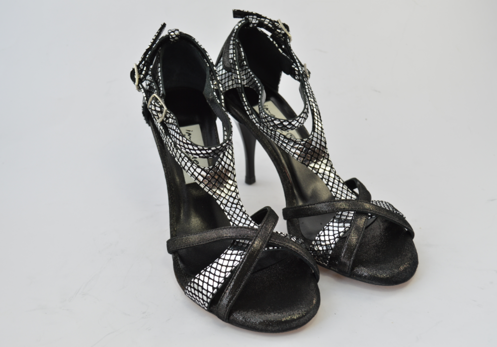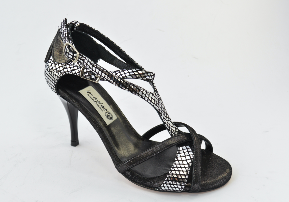 Υπέροχο πέδιλο σε ένα εντυπωσιακό συνδυασμό από ασημί δέρμα “φίδι” και μαύρο δέρμα πέρλα. Αμπιγιέ παπούτσι που μπορεί όμως να φορεθεί και με casual ντύσιμο.