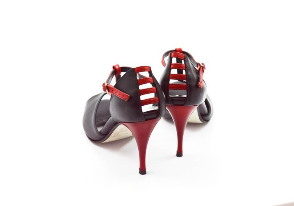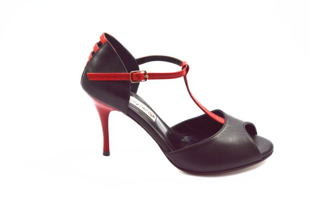 Κλασικό σχέδιο peep toe με ρυθμιζόμενη μπαρέτα “Τ” από μαύρο μαλακό δέρμα, διακριτικά κόκκινα λουράκια και ιδιαίτερη φτέρνα από κόκκινες λωρίδες.