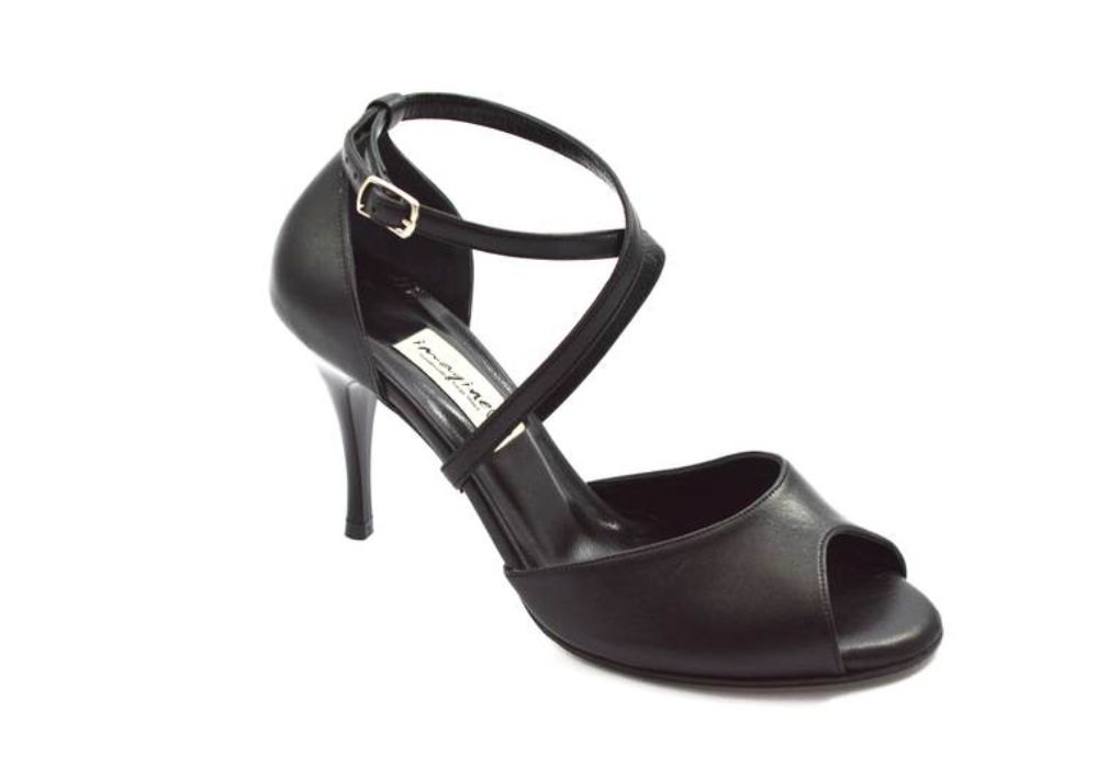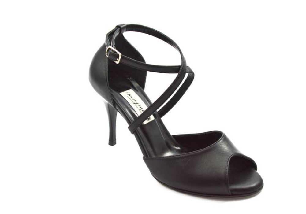Κλασικό σχέδιο peep toe με κοφτή φτέρνα και χιαστί λουράκια στο κουντεπιέ από μαλακό μαύρο δέρμα.