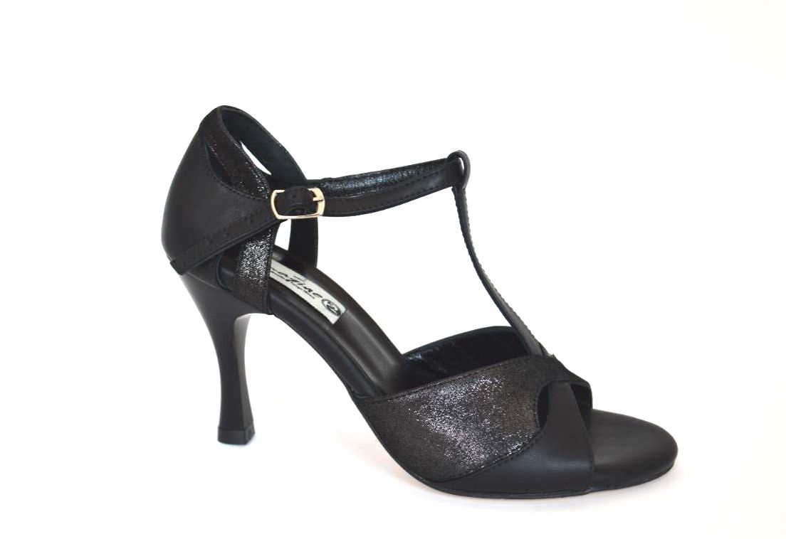 Σχέδιο “πεταλούδα” σε peep toe και ρυθμιζόμενη μπαρέτα “Τ” σε υπέροχο συνδυασμό από μαλακό χρυσό δέρμα και μαύρο σουέτ δέρμα και φινετσάτη φτέρνα.