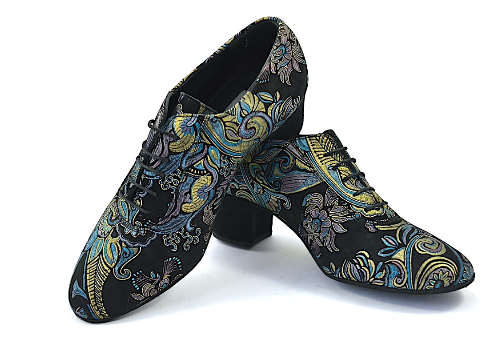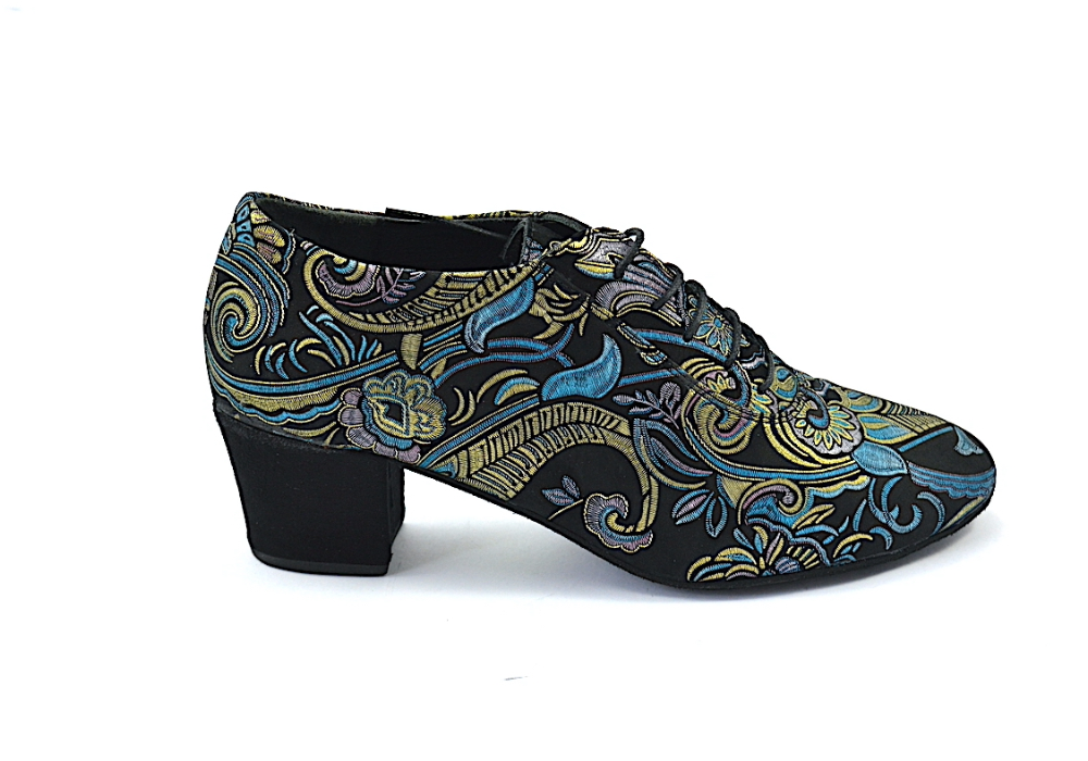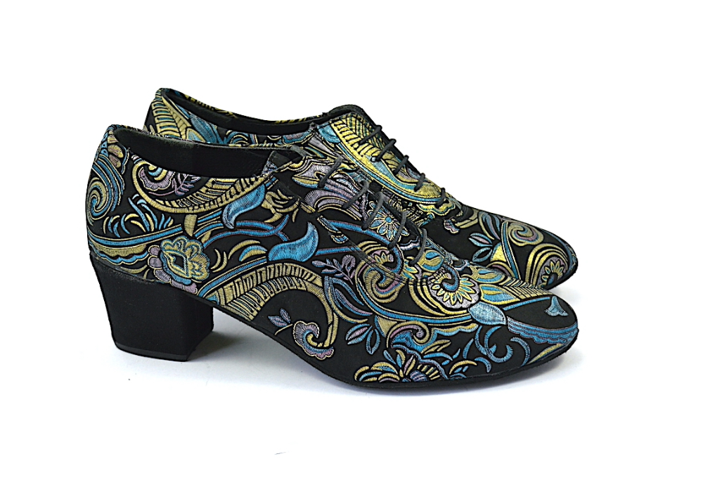Ιδιαίτερο χορευτικό παπούτσι, για πράκτικα και για την μιλόνγκα, τύπου Oxford, από μαλακό μαύρο σουέτ δέρμα, με εντυπωσιακά χρυσο-μπλε λαχούρια.
